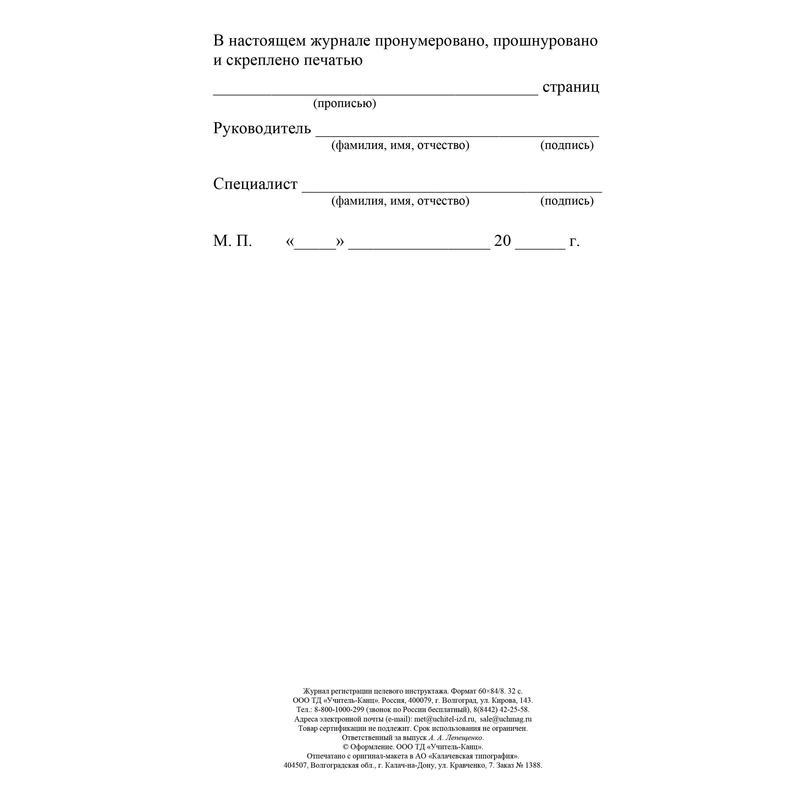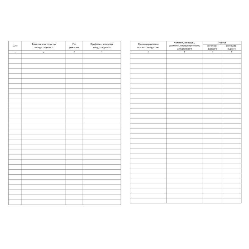 Журнал регистрации целевого инструктажа содержит графы: дата, ФИО инструктируемого, год рождениея, профессия, должность инструктируемого, причина проведения целевого инструктажа, ФИО, должность инструктирующего, допускающего, подписи инстуктируемого и инструктора. Журнал содержит 16 листов писчей бумаги плотностью 60 г/кв.м. Тип крепления — скрепки.