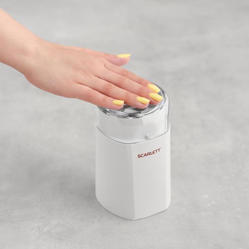 Кофемолка SC-CG44506 выполнена в классическом белом цвете. С помощью импульсного режима, кофе на 2 чашки будет готов уже буквально за пару секунд. Ножи из экостали одинаково качественно измельчат кофе, орехи, специи или сахар. Для удобства в эксплуатации предусмотрена прозрачная крышка, которая поможет осуществлять контроль за процессом помола.