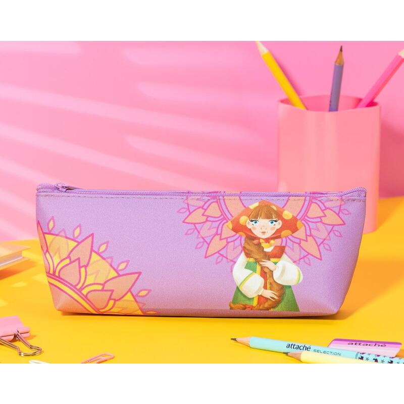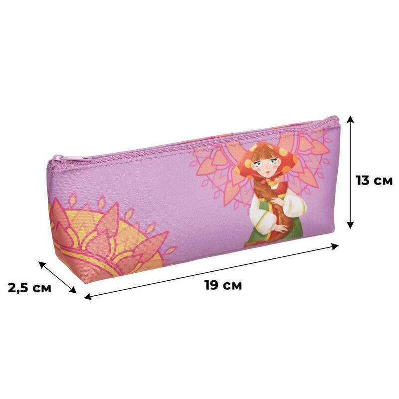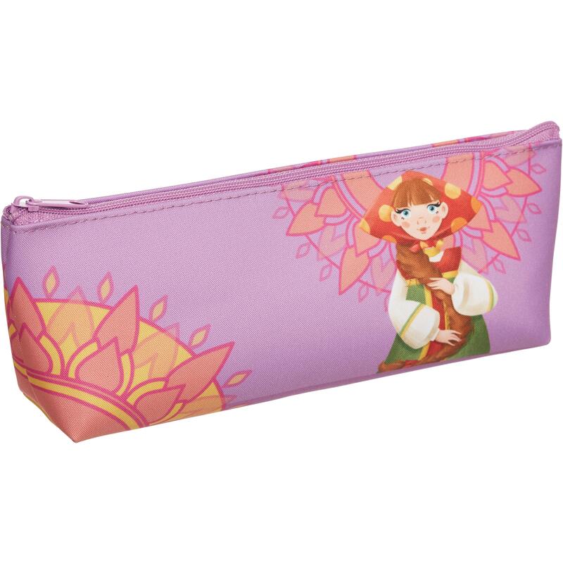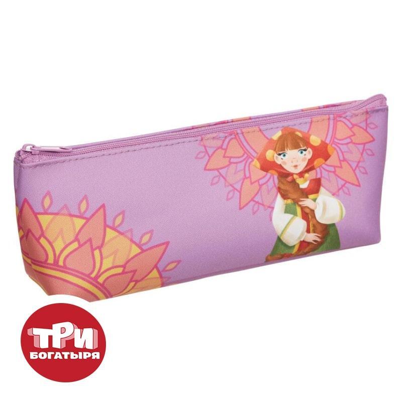 Пенал-косметичка Комус Три богатыря Любава. Вместительное отделение для канцелярских принадлежностей застегивается на молнию. Изготовлен из полиэстера. Без наполнения. Размер: 20×4×10 см. Дизайн: героиня мультфильма «Три богатыря» — Любава.
