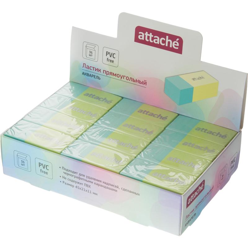 Ластик Attache Акварель имеет прямоугольную форму. Цвет:желто-голубой. Выполнен из термопластичного каучука, не содержит ПВХ. Предназначен для удаления с бумаги надписей, сделанных чернографитными карандашами. Мягко и быстро удаляет надписи, не повреждая поверхность. Изготовлен по технологии Dust-free. Размер: 45?21?11 мм.