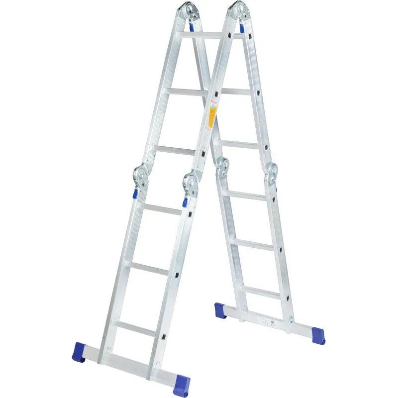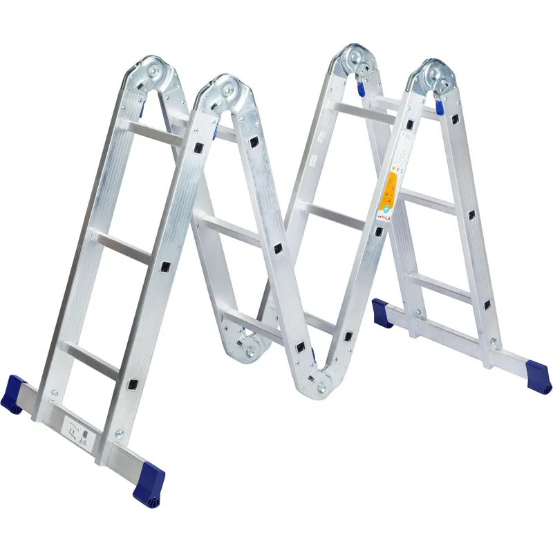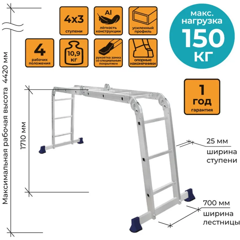 Шарнирная алюминиевая лестница Комус. Представляет собой 4 секции по 3 ступени, которые можно настроить в 4х рабочих положениях. Можно использовать в качестве приставной лестницы, двухсторонней стремянки и помоста. Пригодится в быту — дом, сад, гараж, а также в коммунальной и строительной деятельности.Преимущества изделия:— Противоскользящее рифление на ступенях — пользоваться лестницей безопасно, нога не соскользнет в процессе выполнения работ.— Сочетание легкости и прочности — рама изготовлена из прессованного алюминиевого профиля.— Широкие траверсы — лестница устойчиво фиксируется на горизонтальной поверхности в любом рабочем положении.— Надежные шарнирные механизмы — лестница не шатается в рабочих положениях, смена рабочих положений происходит быстро и легко.— Лестницу удобно хранить и транспортировать, благодаря компактным размерам в сложенном виде. Внешний вид и/или характеристики товара могут быть изменены производителем в соответствии с производственным процессом.