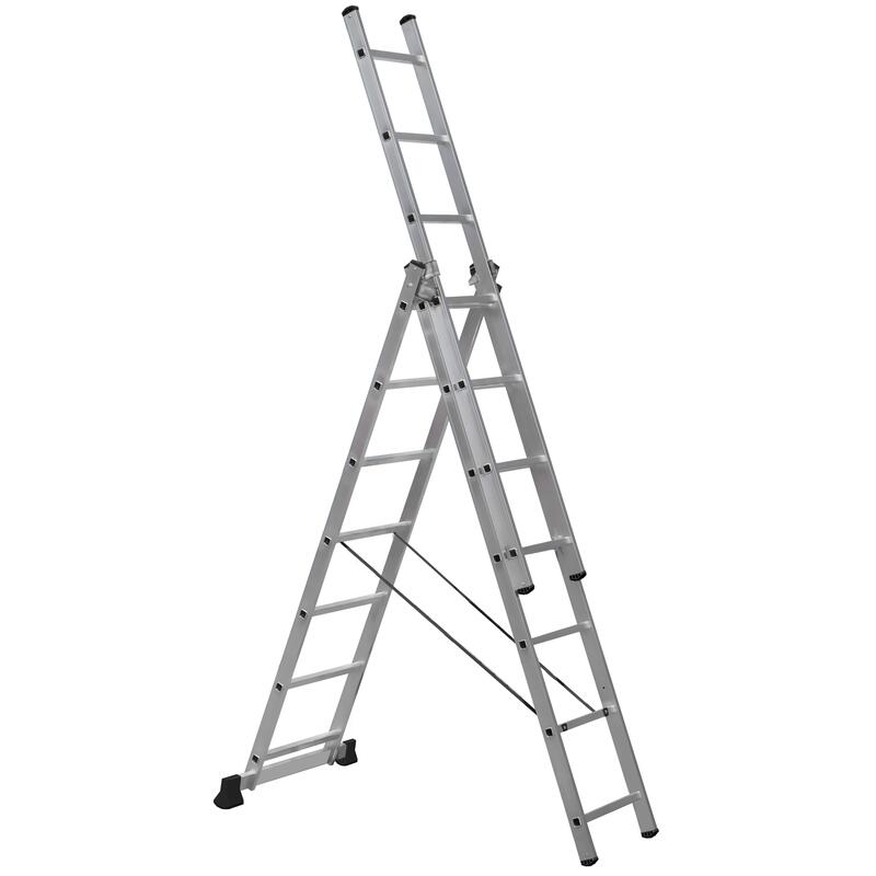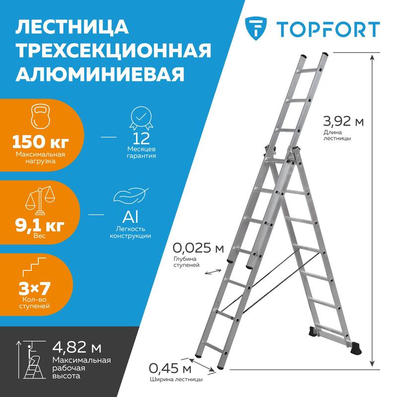 Лестница Topfort алюминиевая трехсекционная 3×7 ступеней. Универсальность данной лестницы заключается в том, что она может использоваться как раздвижная приставная лестница из трех частей и как свободностоящая стремянка (перевернутая русская буква 'У'). Более того третья секция является съемной, и ею можно пользоваться отдельно как приставной лестницей, а оставшаяся часть при этом представляет двухсекционную универсальную лестницу. Эта лестница является по праву наиболее универсальной из всех лестниц, и несмотря на необходимый попарный перехлест секций как в конфигурации 'приставная лестница' так и в конфигурации 'стремянка', что усложняет, утяжеляет и поэтому удорожает ее, является самой популярной по продаваемости из-за своей исключительной универсальности.Необходимый для прочности перехлест второй и третьей секции обеспечивается боковым упором. Вставить третью секцию сверху через верхний соединительный узел и обойти этот упор невозможно.Внешний вид и/или характеристики товара могут быть изменены производителем в соответствии с производственным процессом.