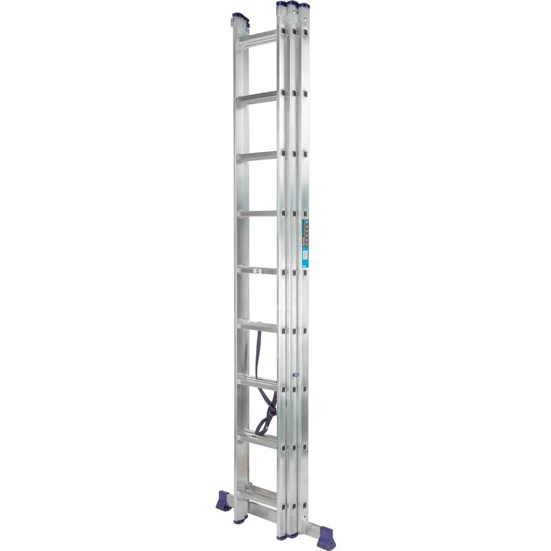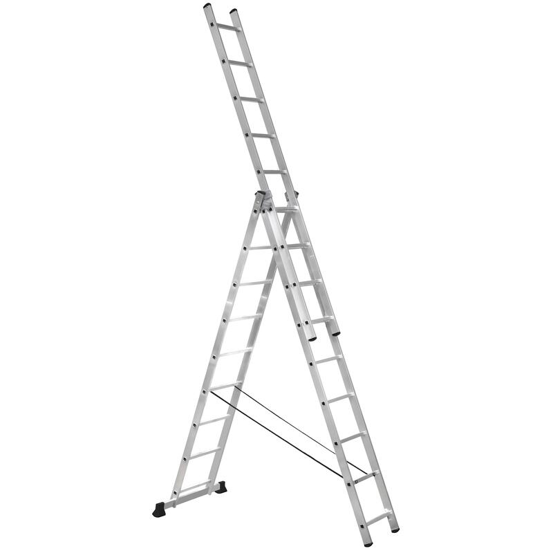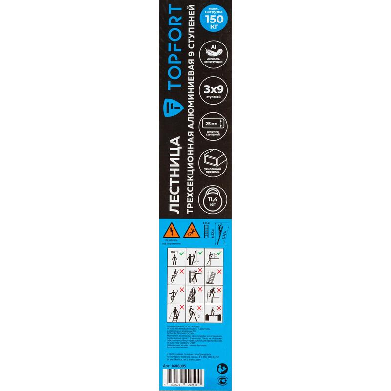Лестница Topfort алюминиевая трехсекционная 3×9 ступеней. Универсальность данной лестницы заключается в том, что она может использоваться как раздвижная приставная лестница из трех частей и как свободностоящая стремянка (перевернутая русская буква 'У'). Более того третья секция является съемной, и ею можно пользоваться отдельно как приставной лестницей, а оставшаяся часть при этом представляет двухсекционную универсальную лестницу. Эта лестница является по праву наиболее универсальной из всех лестниц, и несмотря на необходимый попарный перехлест секций как в конфигурации 'приставная лестница' так и в конфигурации 'стремянка', что усложняет, утяжеляет и поэтому удорожает ее, является самой популярной по продаваемости из-за своей исключительной универсальности.Необходимый для прочности перехлест второй и третьей секции обеспечивается боковым упором. Вставить третью секцию сверху через верхний соединительный узел и обойти этот упор невозможно.Внешний вид и/или характеристики товара могут быть изменены производителем в соответствии с производственным процессом.