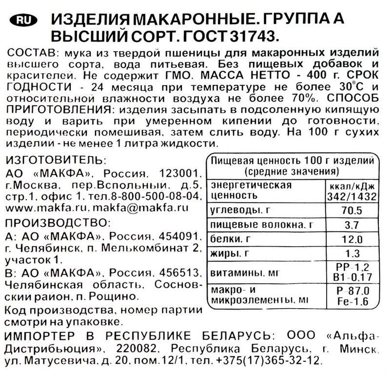 Состав: мука из твердой пшеницы для макаронных изделий высшего сорта, вода питьевая.