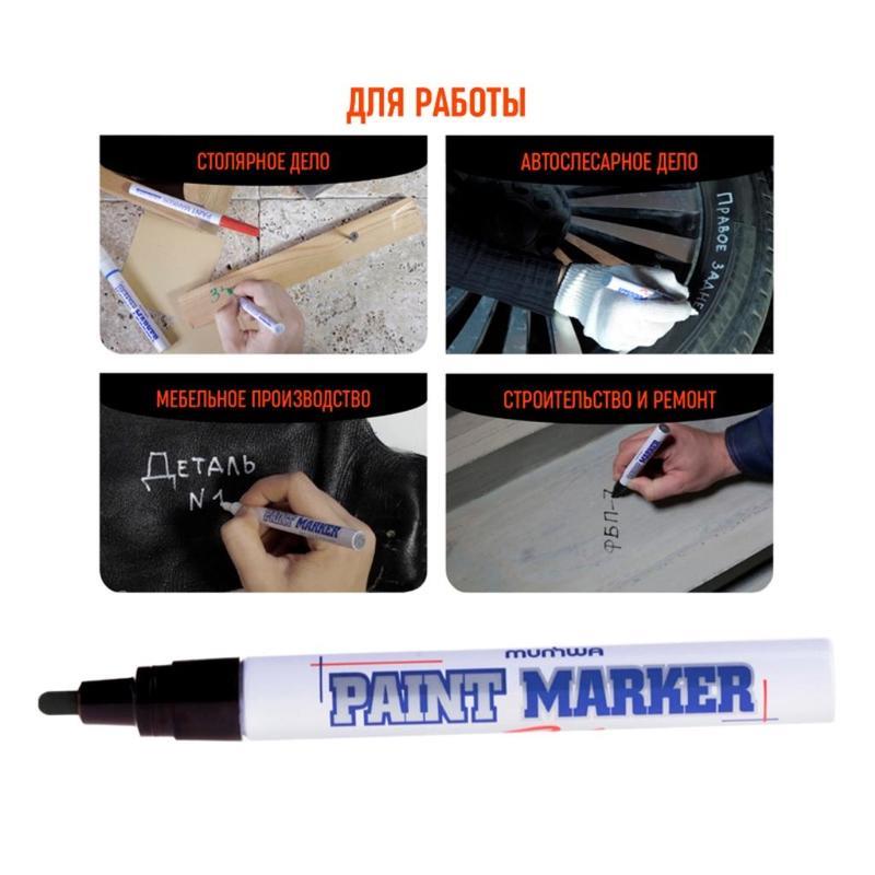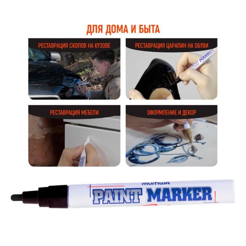 Paint Marker подходит для реставрации дефектов на бытовой технике, обуви, кузове автомобиля, а также надписей на каменных плитах. Маркер-краска MunHwa имеет широкое применения в дизайне, декорировании и оформлении.