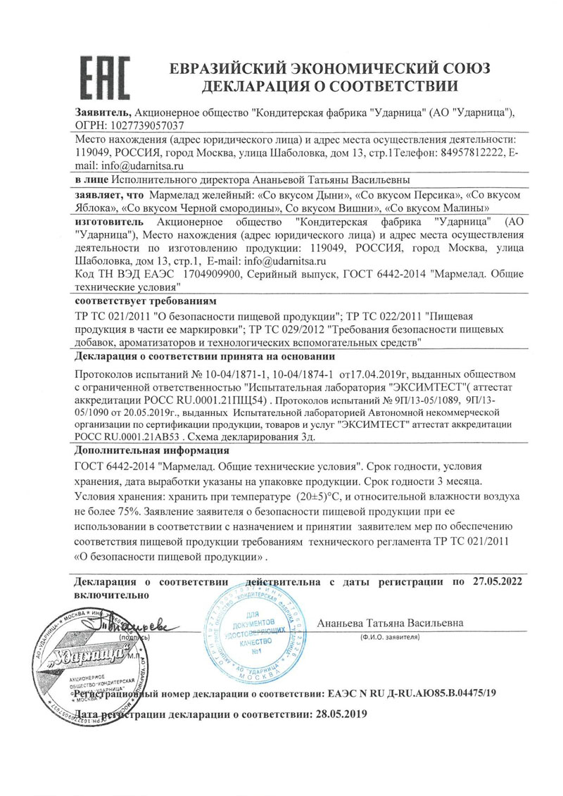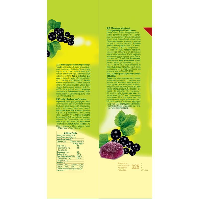 Мармелад от фабрики «Ударница» со вкусом черной смородины — это нежные желейные, легкие и полезные мармелады в форме ромбиков с натуральным составом и вкусом всеми любимой и полезной ягоды. Состав: Сахар, патока, желирующий агент — пектин, регуляторы кислотности — кислота молочная, кислота яблочная, кислота лимонная, цитрат калия 3-замещенный, ароматизатор «черносмородиновый», краситель — антоциан (экстракт из кожицы винограда).
