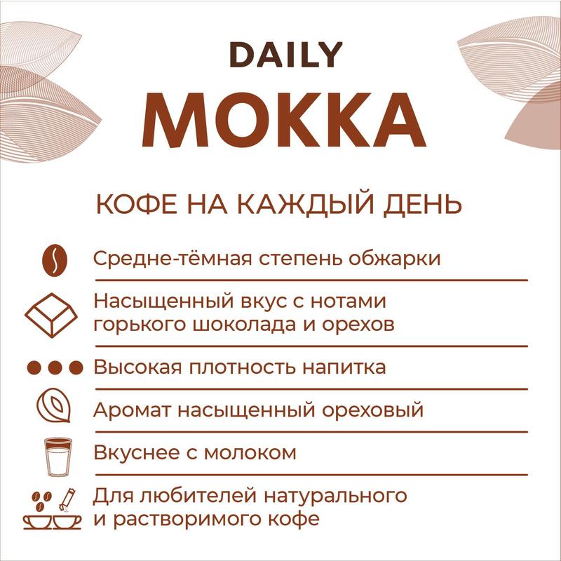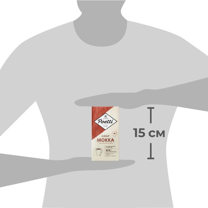 Poetti Daily — это линейка натурального кофе высокого качества на каждый день. Эксперты с многолетним опытом в обжарке кофе и профессиональные бариста разработали бленды, чтобы кофе радовал Вас вкусом и заряжал энергией!Бленд Daily Mokka — это купаж арабики и премиальной робусты средне-темной степени обжарки с насыщенным вкусом и ярким ореховым ароматом. Напиток высокой плотности с нотами горького шоколада и орехов идеально раскрывается при добавлении молока. Степень помола: средняя. Способ приготовления: в чашке, френч-прессе, автоматической кофемашине и гейзерной кофеварке.Чашка Poetti Daily Mokka — насыщенный вкус для бодрого и продуктивного дня!Вес: 250 г. Тип упаковки: вакуумный пакет. Хранить при температуре не выше 27°C и влажности воздуха не более 75%. Страна производства: Россия.