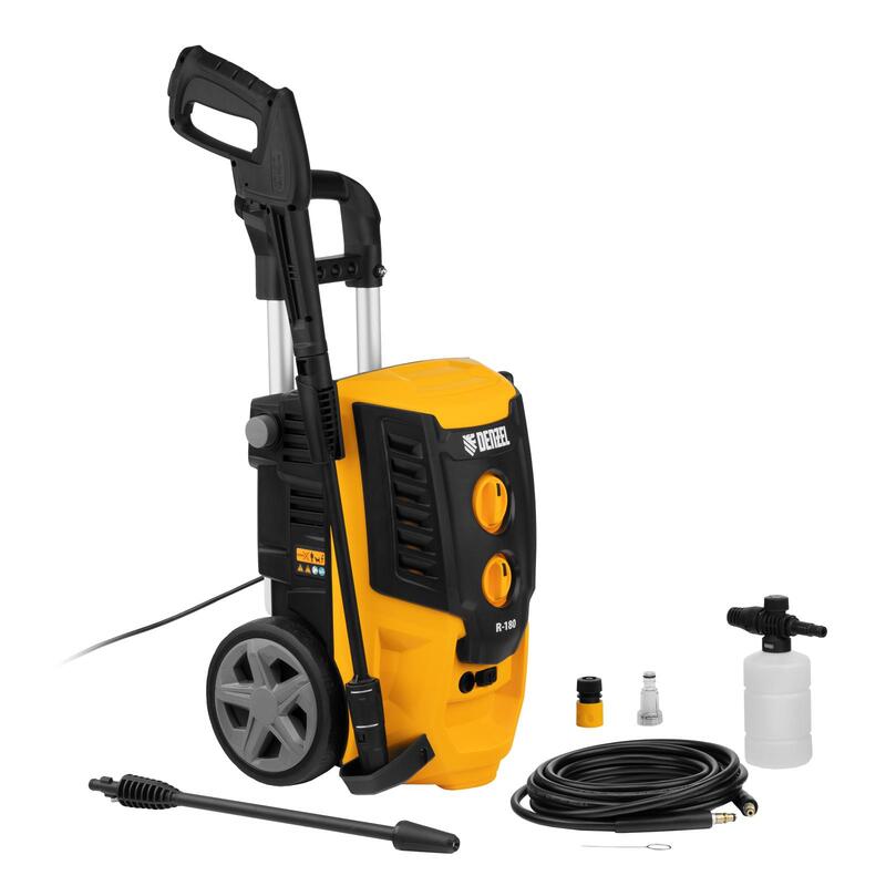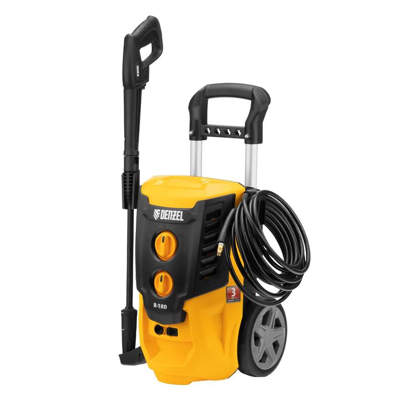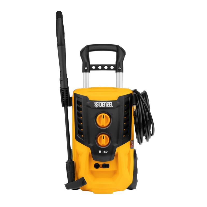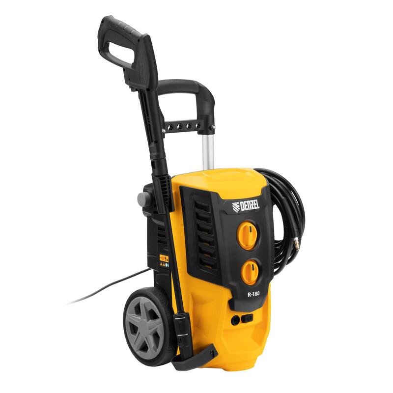 Колесная моечная машина высокого давления Denzel R-180 58238 мощностью 2200 Вт и производительностью 380 л/ч подает струю воды под давлением 180 бар и служит для очищения поверхностей. Позволяет быстро привести в порядок садовые дорожки, удалить пыль и грязь с фасада здания, автомобиля, велосипеда или мотоцикла, отмыть садовый инвентарь. Моечная машина подключается к водопроводу, а при его отсутствии может забирать воду из любого резервуара, работая в режиме самовсасывания. Устройство пригодится для поддержания порядка на загородном участке.