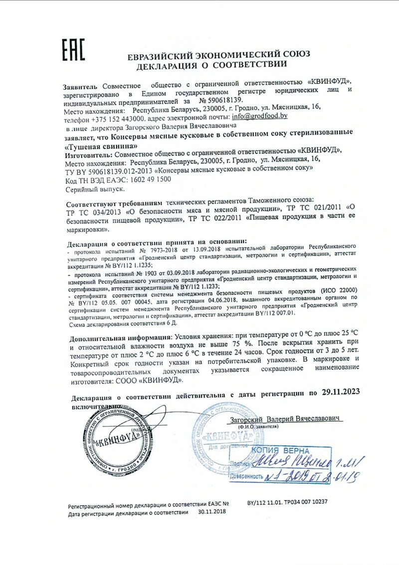 Тушенка Гродфуд «Свинина» готовится из филейных частей с пониженным содержанием жира традиционным способом консервирования согласно всем требования ГОСТ. Продукт готов к употреблению, рекомендуется разогреть. Упакована в жестяную банку, вес 340гр. На крышке предусмотрен ключ для удобства открывания.