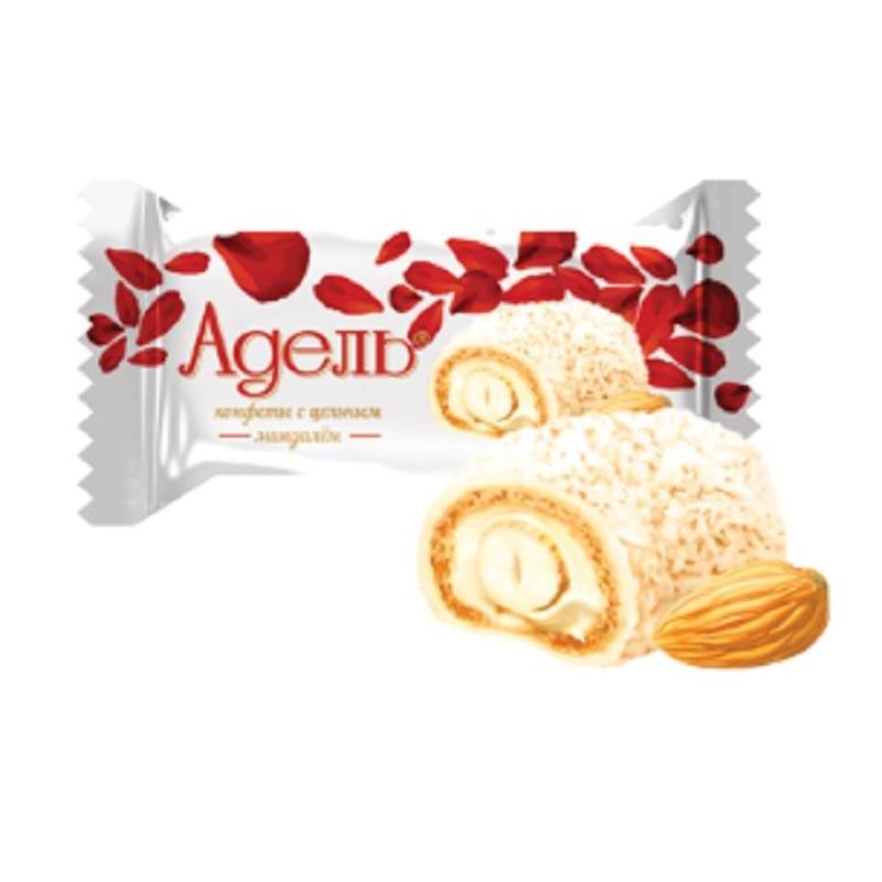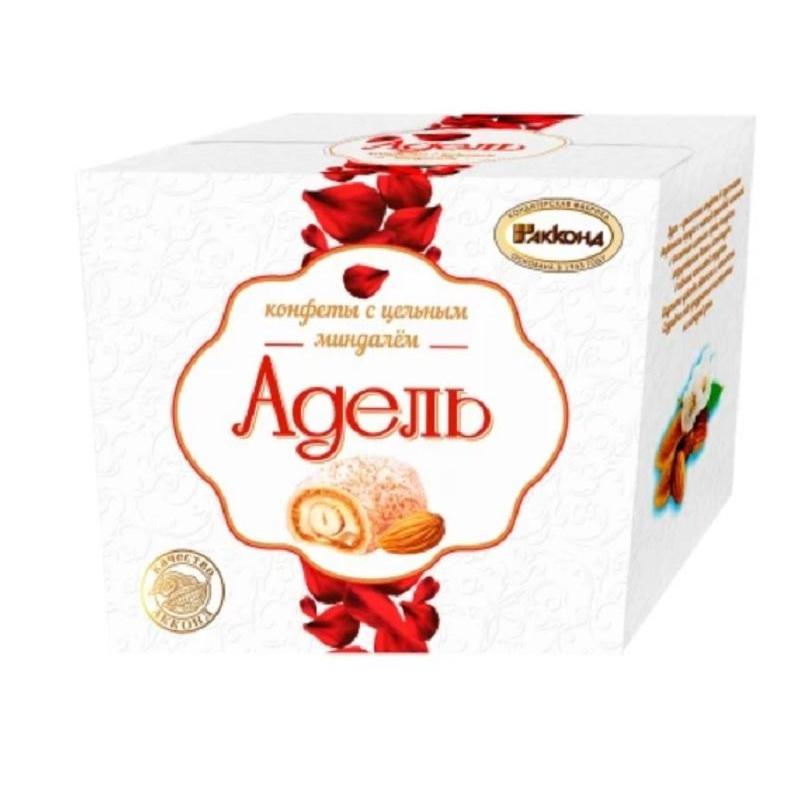 Конфеты Акконд Адель 150 г.Состав: сахар, жир кондитерский (рафинированное дезодорированное растительное масло, антиокислитель — альфа-Токоферол), кокосовая стружка, сухое обезжиренное молоко, орех миндаль, эквивалент масла какао (растительные масла — пальмовое и ши), сыворотка сухая молочная, мука пшеничная, лактоза, обезвоженный молочный жир (пастеризованное молоко), эмульгатор — соевый лецитин, крахмал кукурузный, ароматизаторы, масло кокосовое, яичный порошок, соль, антиокислитель — аскорбиновая кислота.Пищевая ценность на 100 г продукта: белков — 7,8 г, жиров — 42 г, углеводов — 47 г.Энергетическая ценность: 596 ккал.Условия хранения: хранить при Температуре 18+/-3С.Срок годности: 270 дней.Страна: Россия.