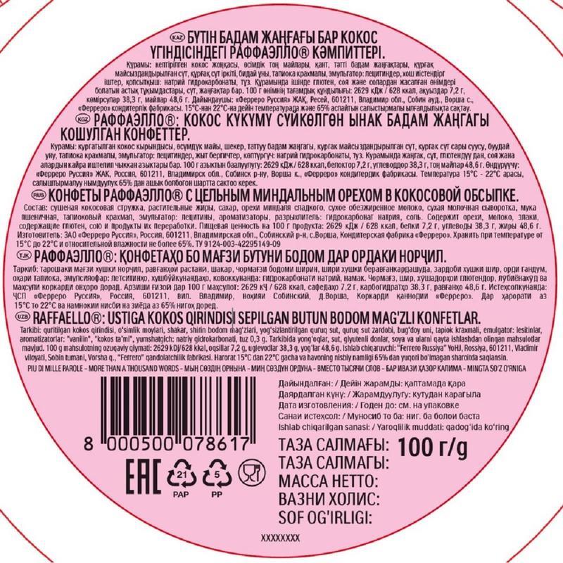 Состав: сушеная кокосовая стружка, сахар, растительные жиры, орехи миндаля сладкого, сухое обезжиренное молоко, сухая молочная сыворотка, мука пшеничная, тапиоковый крахмал, эмульгатор: лецитины, ароматизаторы, разрыхлитель: гидрокарбонат натрия, соль. Содержит орехи, молоко, злаки, содержащие глютен, сою и продукты их переработки.