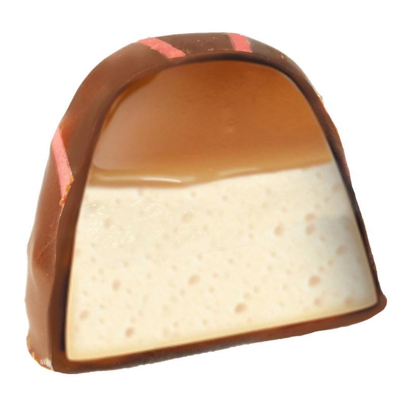Конфеты «Москва» — воздушное суфле с ядрышком из мягкой карамели, покрытое молочным шоколадом с декоративными узорами красных полос.