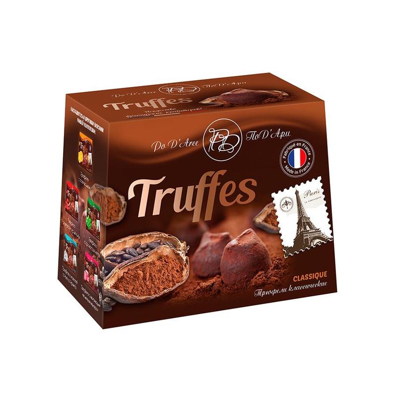 Трюфели шоколадные ПоД’Ари классические 160 г. Состав: масло кокосовое, масло пальмовое, сахар, какао порошок обезжиренный, сыворотка молочная сухая, какао порошок, эмульгатор (лецитин соевый). Продукт может содержать орехи, глютен, яйца и продукты их переработки. Пищевая ценность на 100 г продукта (средние значения): белки — 4,1 г, жиры — 46 г (в том числе: насыщенных жирных кислот 39 г, трансизомеров ненасыщенных жирных кислот 0,4 г), углеводы — 41 г (в том числе сахар 39 г). Энергетическая ценность (калорийность): 2490 кДж, 600 ккал. Срок годности: 15 месяцев. Хранить при температуре (18±3)°C и относительной влажности воздуха не более 75%. Изготовитель: «Chocolat Mathez», 3 Parc d’Actives Saint Jean, 49330 Chateauneuf Sur Sarthe, France, Франция.