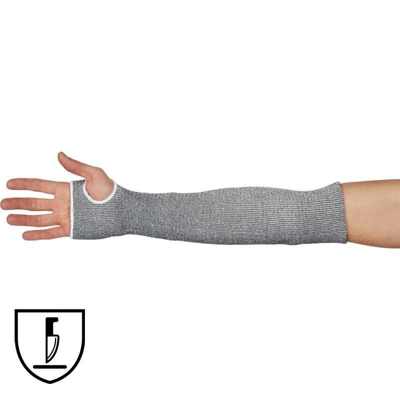 Двухслойный трикотажный нарукавник из высокопрочного волокна «Дайнима» и полиамида для защиты запястья, предплечья и локтевого сгиба от истирания и порезов. Удобное отверстие для большого пальца обеспечивает защиту запястья. Стойкость на порез (усилие на образование пореза 1-го слоя более 16 н/мм2 ). 4-тый уровень защиты по ГОСТ Р ЕН 399-2009. Работа с острыми кромками стекла, металла, пластика. Длина 45 см. Размер: 10. Декларация о соответствие ТР ТС 019/2011, ГОСТ 12.4.252-2013.