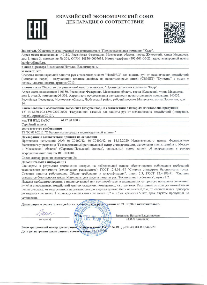 Двухслойный трикотажный нарукавник из высокопрочного волокна «Дайнима» и полиамида для защиты запястья, предплечья и локтевого сгиба от истирания и порезов. Удобное отверстие для большого пальца обеспечивает защиту запястья. Стойкость на порез (усилие на образование пореза 1-го слоя более 16 н/мм2 ). 4-ты уровень защиты по ГОСТ Р ЕН 399-2009. Работа с острыми кромками стекла, металла, пластика. Длина 56 см. Размер: 10. Декларация о соответствие ТР ТС 019/2011, ГОСТ 12.4.252-2013.