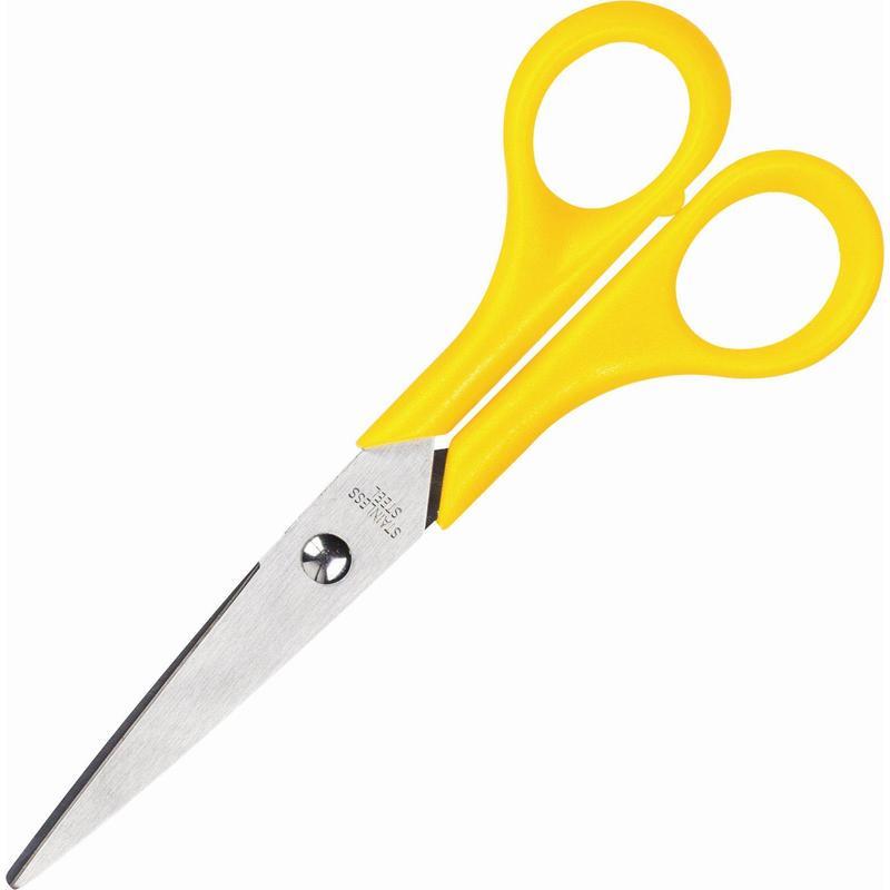 Канцелярские ножницы (офисные) Attache, выполненные из стали. Симметричные пластиковые кольца яркого желтого цвета обеспечивают комфортную работу с материалами любой плотности. Длина ножниц — 16 см. Изделие представлено на картонной подложке.