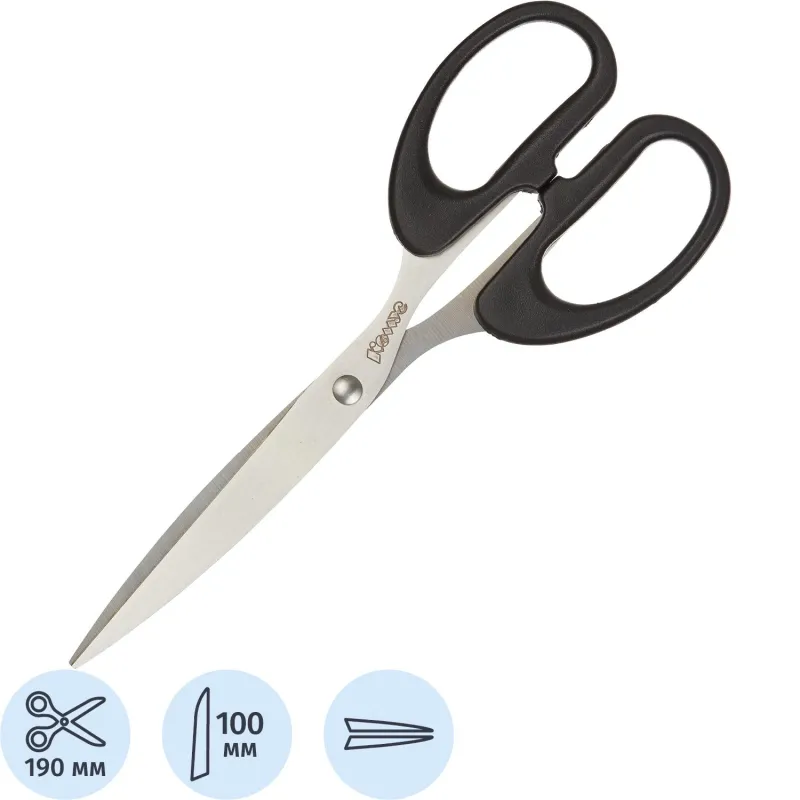 Канцелярские ножницы (офисные) 'Комус', изготовленные из высококачественной нержавеющей стали. Эргономичные пластиковые ручки с удобным захватом обеспечивают комфортную работу с материалами любой плотности. Мягкий и плавный ход лезвий достигается благодаря стальному подшипнику. Трехсторонняя заточка лезвий. Ножницы канцелярские имеют длину 19 cм. Ножницы представлены в блистерной упаковке с еврослотом.