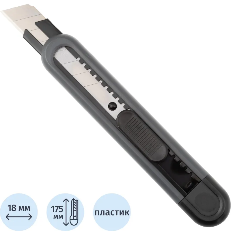 Нож канцелярский для резки бумаги, плотного картона, распечатки корреспонденции и посылок. Эргономичная рукоятка c металлическими направляющими для лезвия увеличивают прочность ножа, создают дополнительную жёсткость при разрезании плотных материалов.