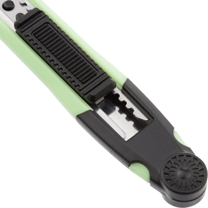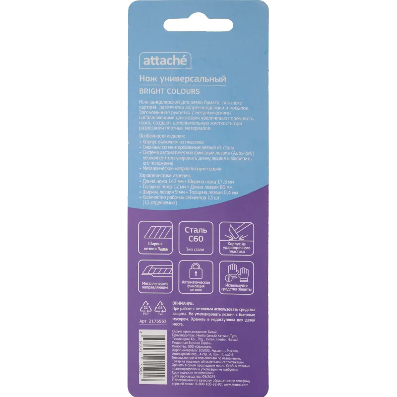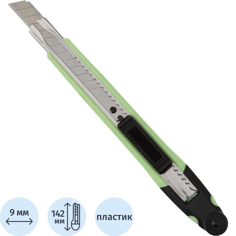 Нож канцелярский для резки бумаги, плотного картона, распечатки корреспонденции и посылок. Эргономичная рукоятка c металлическими направляющими для лезвия увеличивают прочность ножа, создают дополнительную жёсткость при разрезании плотных материалов.