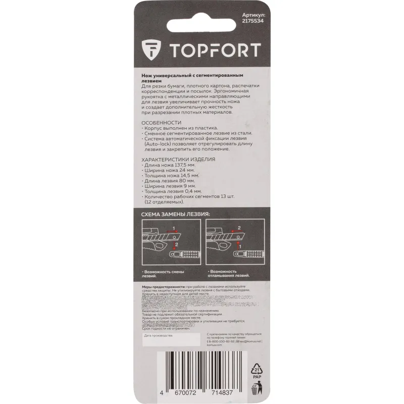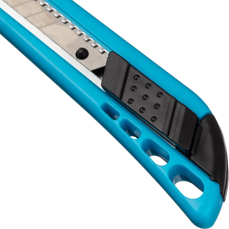 Нож канцелярский для резки бумаги, плотного картона, распечатки корреспонденции и посылок. Эргономичная рукоятка c металлическими направляющими для лезвия увеличивают прочность ножа, создают дополнительную жёсткость при разрезании плотных материалов.
