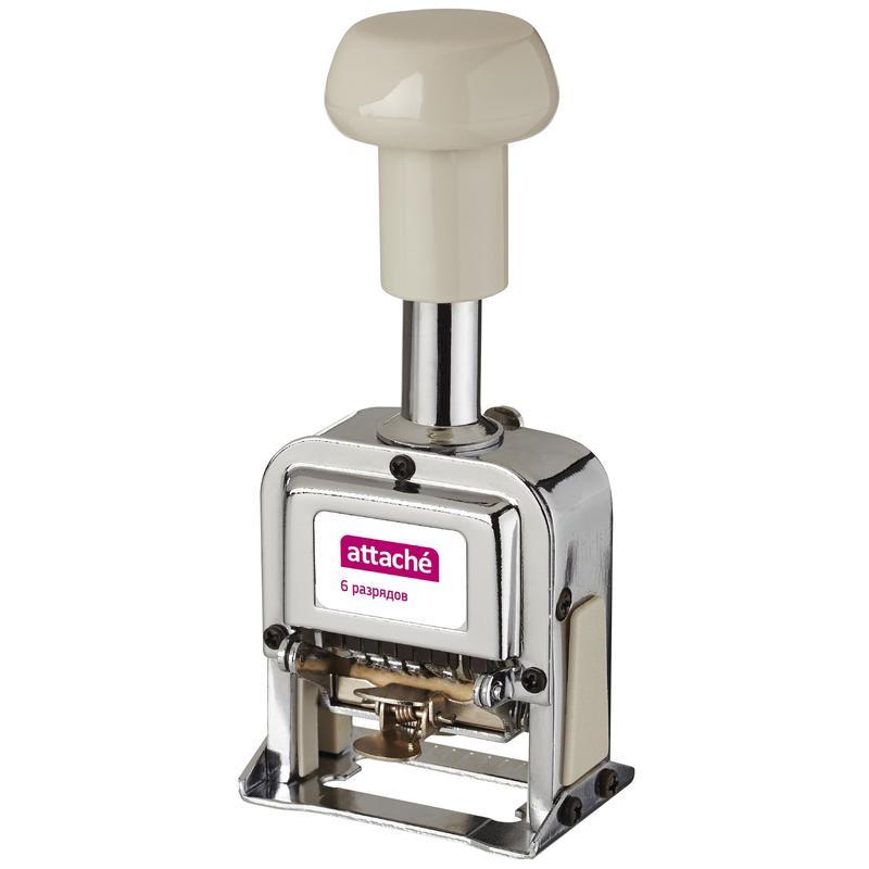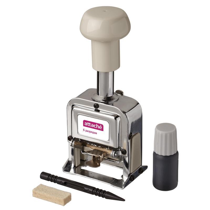 Нумератор автоматический Attache 6-и разрядный, размершрифта 4,8 мм. Металлический корпус. При нажатии на ручкунумератора на бумаге появляется оттиск с номером. Приповторном нажатии номер автоматически увеличивается на единицу.Комплектация: штемпельная подушка, черная краска на маслянойоснове, нумератор может быть зафиксирован на 2,3,4,6 и 12нажатий прежде чем он провернется на 1 цифру далее.
