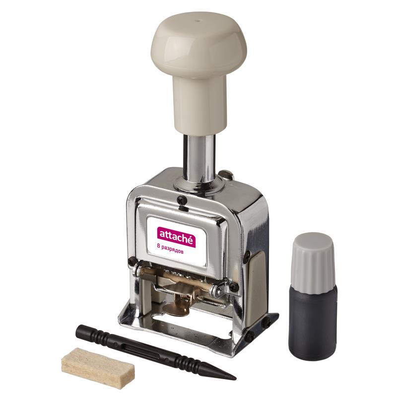 Нумератор автоматический Attache 8-и разрядный, размершрифта 4,8 мм. Металлический корпус. При нажатии на ручкунумератора на бумаге появляется оттиск с номером. Приповторном нажатии номер автоматически увеличивается на единицу.В комплект входит штемпельная подушка и черная краска. Пробеланет. Подушки сменные артикул 546038.