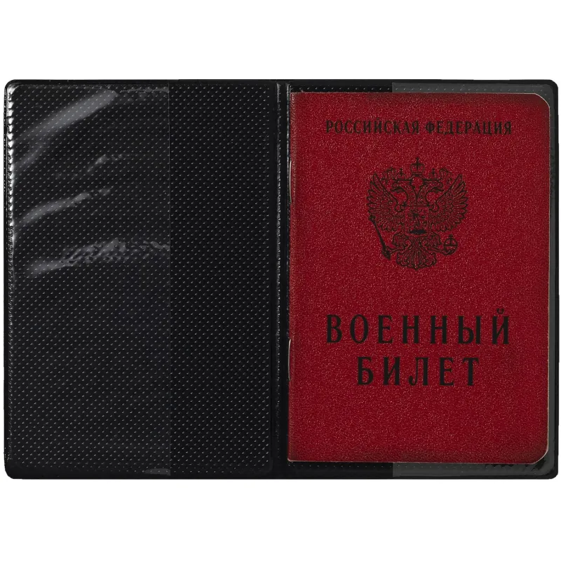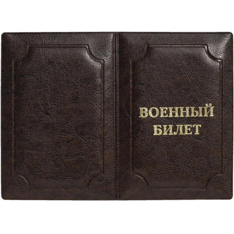 Обложка для военного билета выполнена из искусственной кожи, с картоном внутри. На лицевой стороне методом тиснения золотой фольгой нанесена надпись «военный билет».