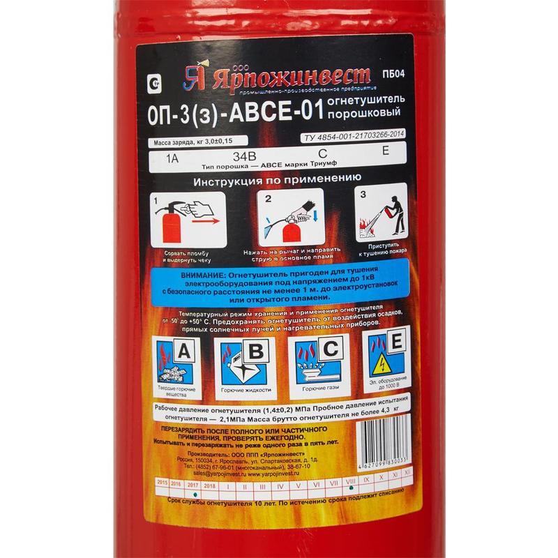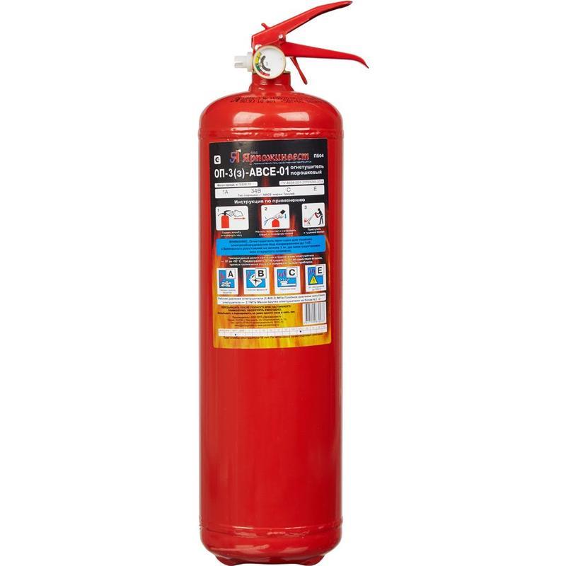 Огнетушитель порошковый ОП-3 (з) АВСЕ предназначен для защиты помещений производственного и хозяйственного назначения, применения на автомобильном, железнодорожном, речном транспорте, морских судах и в бытовых условиях в качестве первичных средств тушения пожаров классов А (твердых горючих веществ), В (жидких горючих веществ), С (газообразных горючих веществ) и электроустановок, находящихся под напряжением до 1000 В. Огнетушитель не предназначен для тушения загораний щелочных и щелочноземельных металлов и материалов, горение которых может происходить без доступа воздуха. Комплектация огнетушитель заряженный с опломбированным ЗПУ с распылителем, руководство по эксплуатации, объединенное с паспортом.