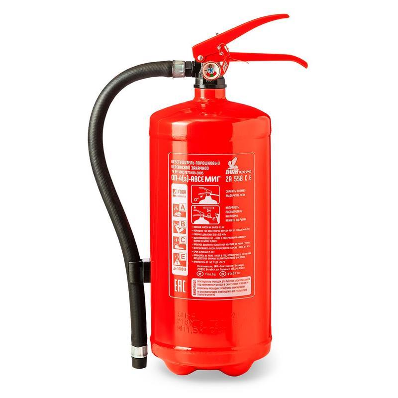 Огнетушитель порошковый ОП-4(з) «Миг» ABCE закачной огнетушитель для защиты общественных зданий и помещений категорий Г и Д. Применяется также на грузовых автомобилях и автобусах МАЗ. Эффективен при тушении горючих жидкостей и газов, твердых веществ и электрооборудования под напряжением до 1000 В. Рекомендуется использовать при температуре от −50 до 50 градус.C. Огнетушитель способен подавать струю огнетушащего состава на расстояние не менее 3-х метров.