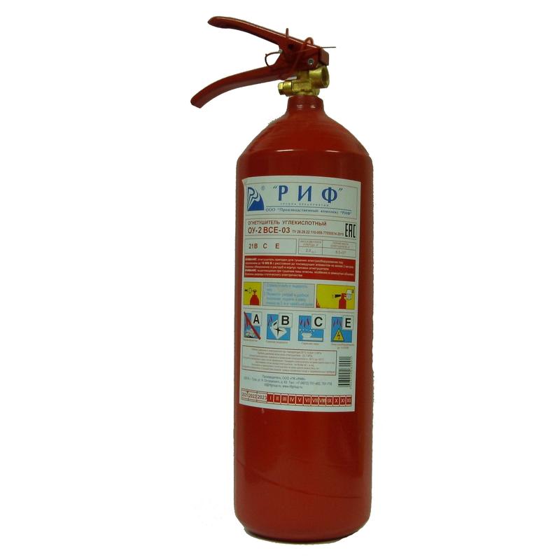 Огнетушитель углекислотный ОУ-2 Риф ВСЕ — 2-х килограммовый углекислотный огнетушитель. Углекислотные огнетушители используют для тушения веществ, горение которых требует доступа воздуха. Применяют для тушения электроустановок под напряжением, устранения возгораний на электрифицированном железнодорожном транспорте, складах горючих материалов, в архивах, музеях, офисах и жилых домах. Главное преимущество огнетушителей данного типа — двуокись углерода не повреждает объект возгорания и не оставляет на нем следов.Эти огнетушители нельзя использовать для тушения: твердых горючих веществ (возгорания класса, А); веществ, горение которых протекает без доступа воздуха (D), электроустановок под напряжением более 10 кВ.Огнетушащая способность (ранг огнетушителя) , 21В.Температура эксплуатации: от ?40 С до 50 С.Вес огнетушителя: 7,0 1 кг.Объем заряда: 2,0–0,1 килограмма.Объем баллона: 2,7 0,1 литра.Время подачи состава — не менее 6 секундДиаметр баллона: 114 мм.Срок службы огнетушителя: 10 лет.Огнетушитель относится к сегменту 'эконом'. Качество соответствует требованиям нормативных документов.