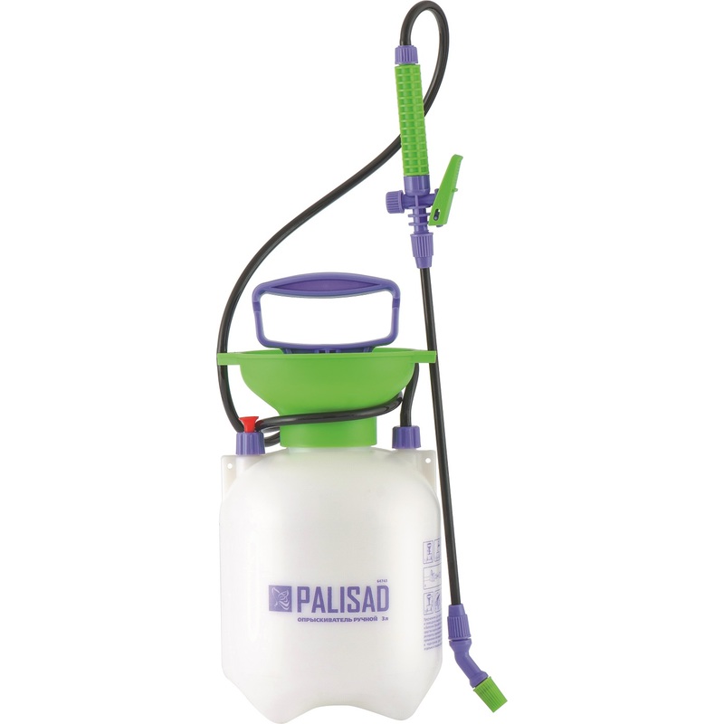Ручной опрыскиватель Palisad 64743 с баком объемом 3 л, горловиной, насосом, шлангом и разбрызгивателем, используется для ухода за растениями на грядках, клумбах и в теплицах. Устройство предназначено для распыления пестицидов и внесения удобрений. Широкое заливочное горло позволяет быстро наполнить емкость раствором. Ремень для ношения на плече позволяет освободить руки для более комфортной работы.Преимущества:Опрыскиватель характеризуется прочностью и долговечностью, т. к. изготовлен из износостойкого пластика.Подача жидкости контролируется при помощи регулируемой распыляющей головки.Возможность непрерывного распыления обеспечивается фиксатором на ручке опрыскивателя.Форсунка защищена от засорения, поскольку водозаборный шланг оснащен фильтром.Безопасность работы обеспечивается клапаном сброса избыточного давления.Расход жидкости можно контролировать при помощи мерной шкалы.Опрыскиватель можно переносить за ручку помпового насоса.Внешний вид и/или характеристики товара могут быть изменены производителем в соответствии с производственным процессом.