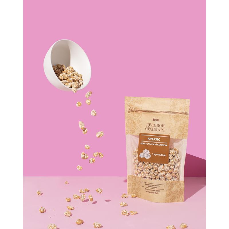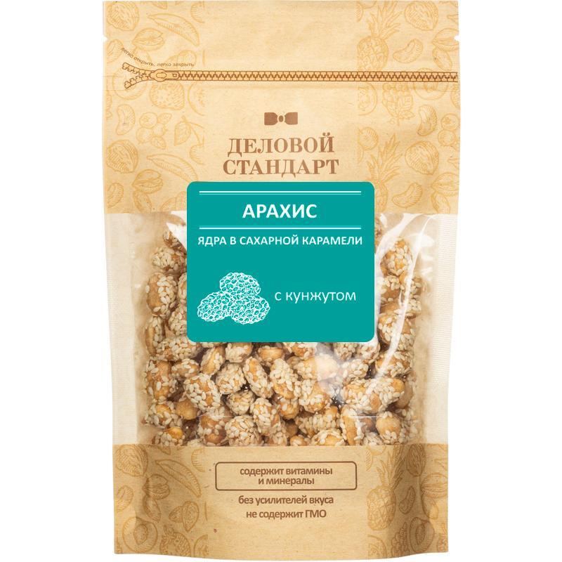 Арахис в карамели с кунжутом 'Деловой Стандарт' можно использовать в качестве аппетитного перекуса, находясь в дороге, в офисе или дома. Сладкий арахис в сочетании с семенами кунжута подойдет в качестве десерта к свежесваренному кофе или чашке любимого чая. — Состав: ядра арахиса обжаренные, сахар, семена кунжута. — Пищевая ценность: белки — 20 г, жиры — 39 г, углеводы — 36 г. — Энергетическая ценность: 570 ккал/2380 кДж. — Срок годности: 6 месяцев. — Условия хранения: при температуре от 5 до 25°С и относительной влажности воздуха не более 70%. — Вес: 200 г. — Страна производства: Россия. Возможно присутствие в незначительном количестве частиц орехов, арахиса, кунжута, глютена и продуктов переработки молока.