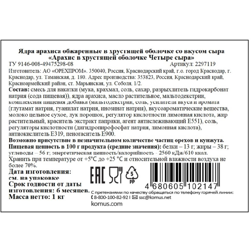Состав: смесь для накатки (мука, крахмал, соль, сахар, разрыхлитель гидрокарбонат натрия (сода пищевая)), ядра арахиса, масло растительное, мальтодекстрин, комплексная пищевая добавка (мальтодекстрин, соль, усилители вкуса и аромата (глутамат натрия, гуанилат натрия, инозинат натрия), вкусоароматические вещества, молоко цельное сухое, лук порошок, регулятор кислотности лимонная кислота, жир растительный, краситель экстракт паприки, агент антислеживающий Е551), соль, регуляторы кислотности (дигидропирофосфат натрия, лимонная кислота), антиокислитель Е319, пеногаситель Е900.