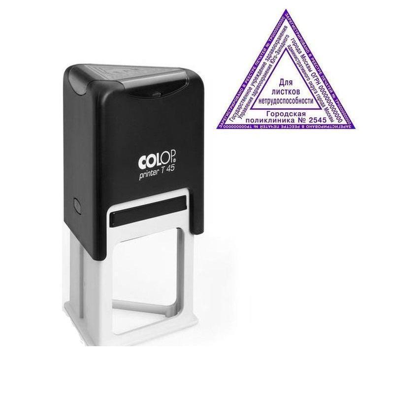 Первая в мире, запатентованная оснастка треугольной формыНадежный пластиковый корпус с автоматическим окрашиванием текстаИспользуется под изготовление клише для поликлиник, больниц и др. (заказывается отдельно).В комплекте: оснастка, сменная подушка синего цвета E/Т45 (арт. 219021), демпферный слой (двусторонний скотч) для крепления клише.Размер 45х45х45 мм.