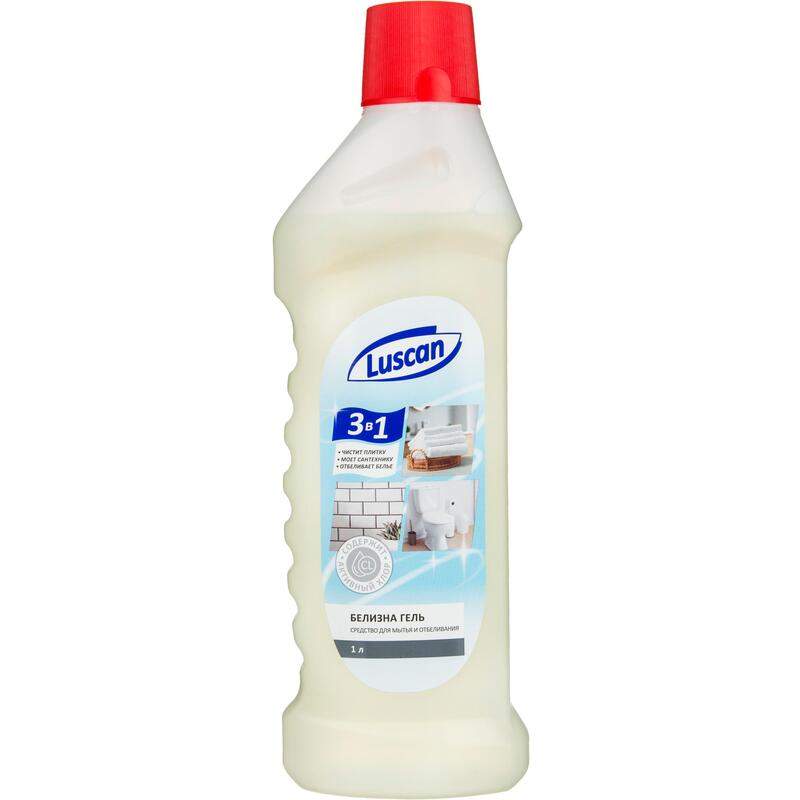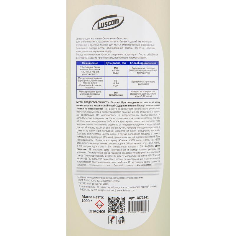 Отбеливатель Luscan белизна-гель 1 л.Назначение: для отбеливания и удаления пятен с белых изделий из хлопчатобумажных и льняных тканей, для мытья эмалированных, фарфоровых фаянсовых поверхностей, облицовочной плитки, пластика, раковин, ванн, унитазов, мусорных ведер. Способ применения: перед применением флакон энергично встряхнуть, для отбеливания белья: развести 250 мл средства в 10 л воды, замочить белье на 30–40 мин, выстирать и тщательно прополоскать; для чистки и дезинфекции санузлов, мусорных ведер: нанести средство на загрязненный участок на 5–10 мин, потереть щеткой и смыть водой; для мытья эмалированных, фарфоровых, фаянсовых поверхностей, облицовочной плитки, пластика: развести 50 мл средства в 1 л воды, вымыть поверхность, смыть водой и протереть влажной тряпкой; После обработки раствором изделие прополоскать, поверхность промыть водой. Меры предосторожности: Опасно! Едкое вещество! Содержит активный хлор! Использовать только по назначению! При работе со средством использовать резиновые перчатки. Применять в проветриваемом помещении. Не смешивать с другими средствами. Не использовать на поврежденных эмалированных и металлических поверхностях. Не использовать для шелка и цветных тканей, не допускать попадания на мебель и ковры. Условия хранения: хранить в плотно закрытой таре в вертикальном положении, отдельно от пищевых продуктов, в недоступном для детей месте, вдали от солнечных лучей. Избегать попадания средства в глаза и на кожу. При попадании средства на кожу немедленно промыть большим количеством чистой воды. В случае попадания средства в глаза — немедленно длительно (15 мин) промыть их чистой проточной водой. При необходимости обратиться к врачу. Состав: >30% вода, >5%, но <30% отбеливающее вещество на основе хлора (< 5% активный хлор), < 5% АПАВ, < 5% гидроксид натрия, < 5% метасиликат натрия, < 5% АмфПАВ. Срок годности: 12 месяцев. Дата изготовления и номер партии указаны на упаковке. По истечении 6 месяцев использовать, увеличивая норму расхода в 2 раза. Транспортировать и хранить при температуре не ниже −30 °С и не выше 25 °С. Средство замерзает, после размораживания и интенсивного встряхивания восстанавливает свои свойства.