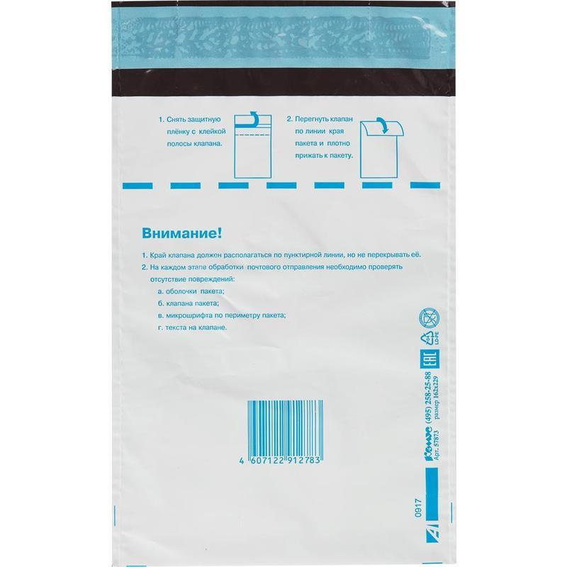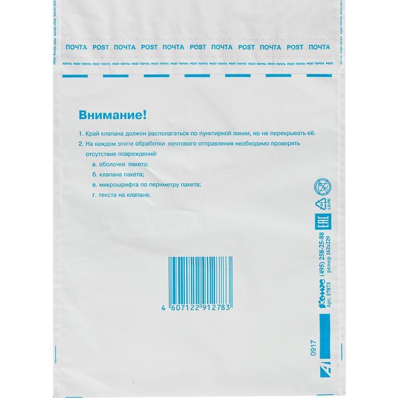 Почтовый пакет формата С5 (размер 162×229 мм) изготовлен из трехслойного непрозрачного полиэтилена толщиной 70 мкм. Предназначен для упаковки всех видов почтовых отправлений — писем, бандеролей, мелких посылок (простых, заказных, с объявленной ценностью). Имеет почтовый подсказ «Куда-Кому», снабжен отрывной клейкой лентой. Поверхности определенных зон пакета обеспечивают качество наносимых шариковой ручкой надписей, оттисков штемпелей и не допускают их истирания при обработке и транспортировке.Многослойный полиэтилен высокой прочности защищает вложение от влаги и механических повреждений, непрозрачность исключает возможность определить содержимое. Любая попытка несанкционированного вскрытия выявляется благодаря специальному прочному шву с микротекстом и специальным линиям просечек с защитным текстом на клапане.Почтовые пакеты можно приобрести как поштучно, так и упаковкой из 500 штук (стоимость указана за штуку).Страна производства — Финляндия. Срок хранения неограничен.
