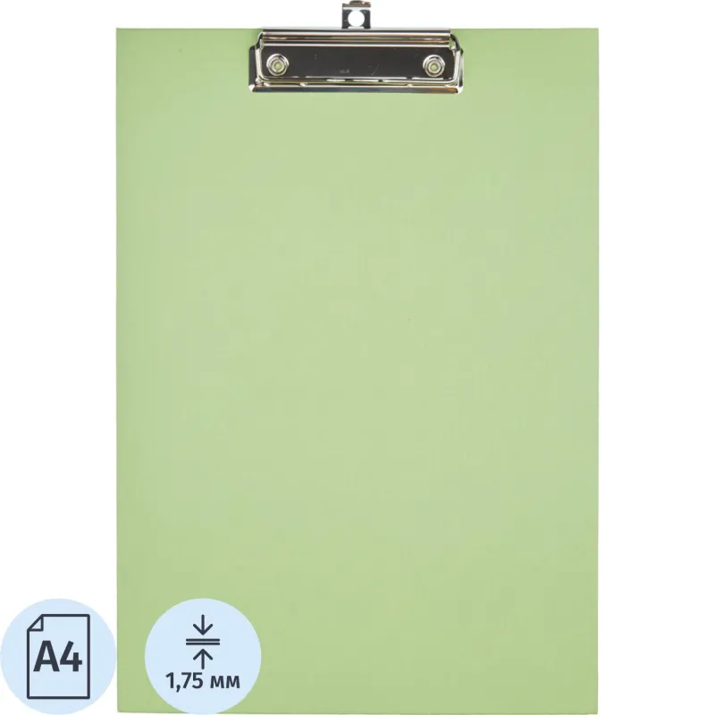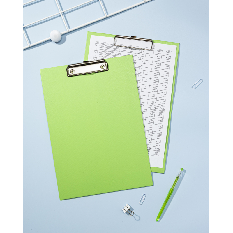 Планшет для бумаг Комус формата А4 изготовлен из плотного картона, покрытого пластиком (бумвинилом) цвета лайм. Позволяет комфортно работать с документами на весу. Металлический прижим надежно удерживает листы и файлы.