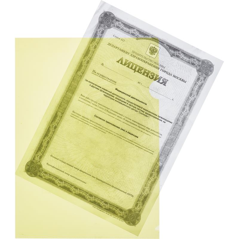 Папка-уголок формата А4 изготовлена из мягкой полипропиленовой пленки. Толщина пленки — 100 мкм. Папка вмещает до 40 листов стандартной плотности. В упаковке 10 штук.
