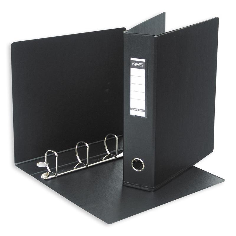 Папка на четырех кольцах Bantex изготовлена из плотного картона, с внешней и внутренней стороны обтянута ПВХ-пленкой черного цвета. Формат А4. По нижнему краю окантована дополнительным слоем пленки по запатентованной технологии Strong Line, предотвращающей царапины на мебели. Папка снабжена механизмом на четырех кольцах D-типа из особо прочной стали. Диаметр кольца — 45 мм. Корешок шириной 60 мм имеет пластиковый карман со сменной двусторонней этикеткой и кольцо для удобства захвата. Папка вмещает до 350 листов стандартной плотности.