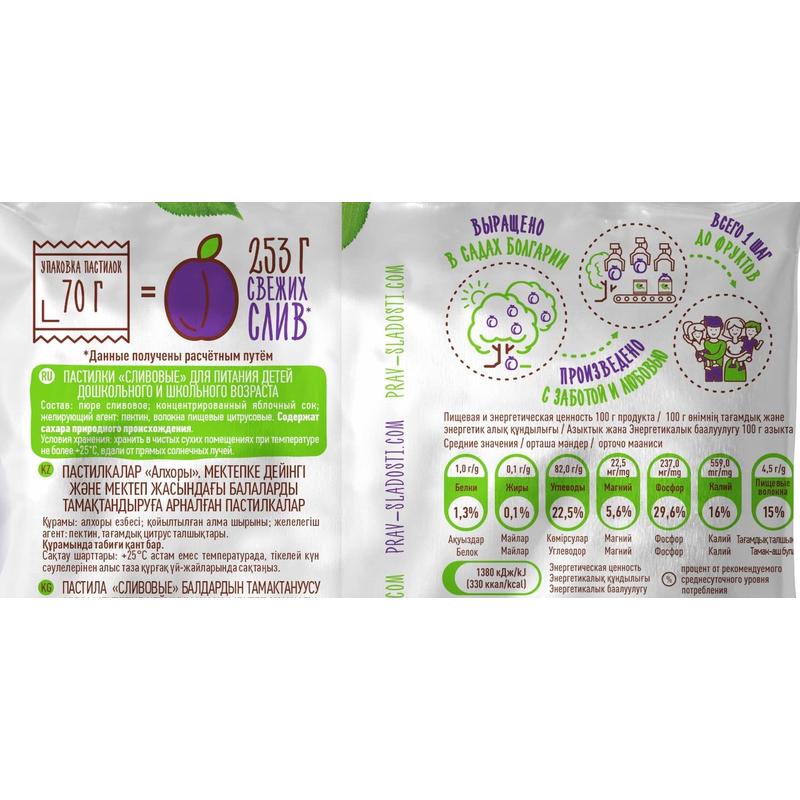 Пастилки Правильные сладости Сливовые 70 г. Состав: пюре сливовое, концентрированный яблочный сок, загуститель: пектин, волокна пищевые цитрусовые. Пищевая ценность: белки - 1,0 г, жиры - 0,1 г, углеводы - 82,0 г. Энергетическая ценность: 330 ккал, 1380 кДж. Срок годности: 180 суток. Условия хранения: при температуре от +15°С до +21°С. Страна производства: Россия.