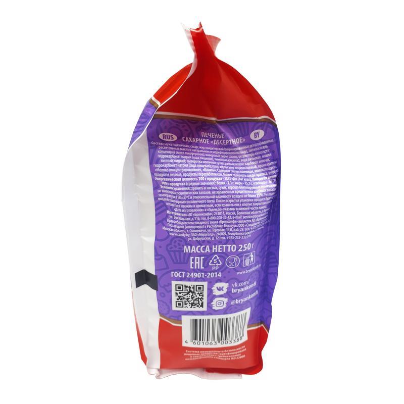 Печенье сахарное Брянконфи «Десертное» 250 г — мелкое печенье, посыпанное сахаром и политое сиропом, в яркой, красочной упаковке.