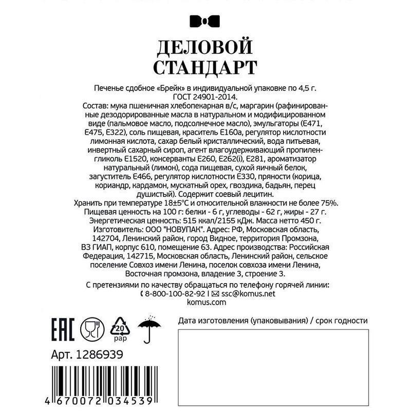 Печенье Деловой Стандарт — хрустящее печенье, на основе пшеничной муки с добавлением ароматных пряностей. Отлично подойдет для небольшого перекуса за чайной паузой дома или на работе! Каждое печенье упаковано, поэтому его удобно брать с собой, а также расположить в зонах переговорной, шоу-рума или ресепшн. Хрустящий вкус и пряный ароматный — заряд энергии на целый день.