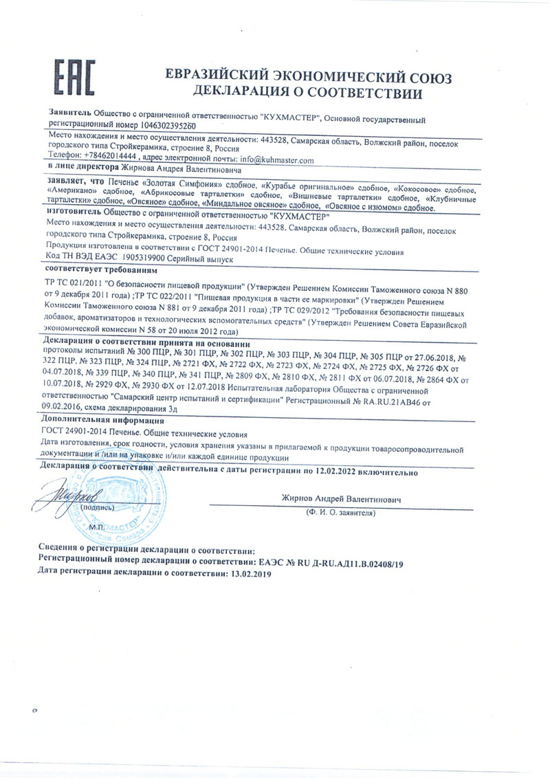 Сдобное печеньеСостав: Мука пшеничная высший сорт, сахар, вода, яичный порошок, соль, разрыхлитель (сода пищевая, пирофосват натрия), ароматизатор идентичный натуральному — ванилинПротивопоказано при индивидуальной непереносимости яичного и молочного белка, глютена.Пищевая ценность среднее значение на 100г продукта: белки — 6,9г; жиры — 26,29г,; углеводы — 56,26г.Энергетическая ценность: 488ккал.Условия хранения: хранение при t=18±3'С и относительной влажности воздуха не более 75%, в хорошо проветриваемом помещении, чистых складах, не зараженных вредителями, отдельно от отопительных приборов, пахучих веществ и попадания прямого солнечного света.Срок годности 12 месяцев.Внимание! Продукты питания надлежащего качества обмену и возврату не подлежат согласно Закону РФ от 07.02.1992 N 2300–1 (ред. от 03.07.2016) «О защите прав потребителей».