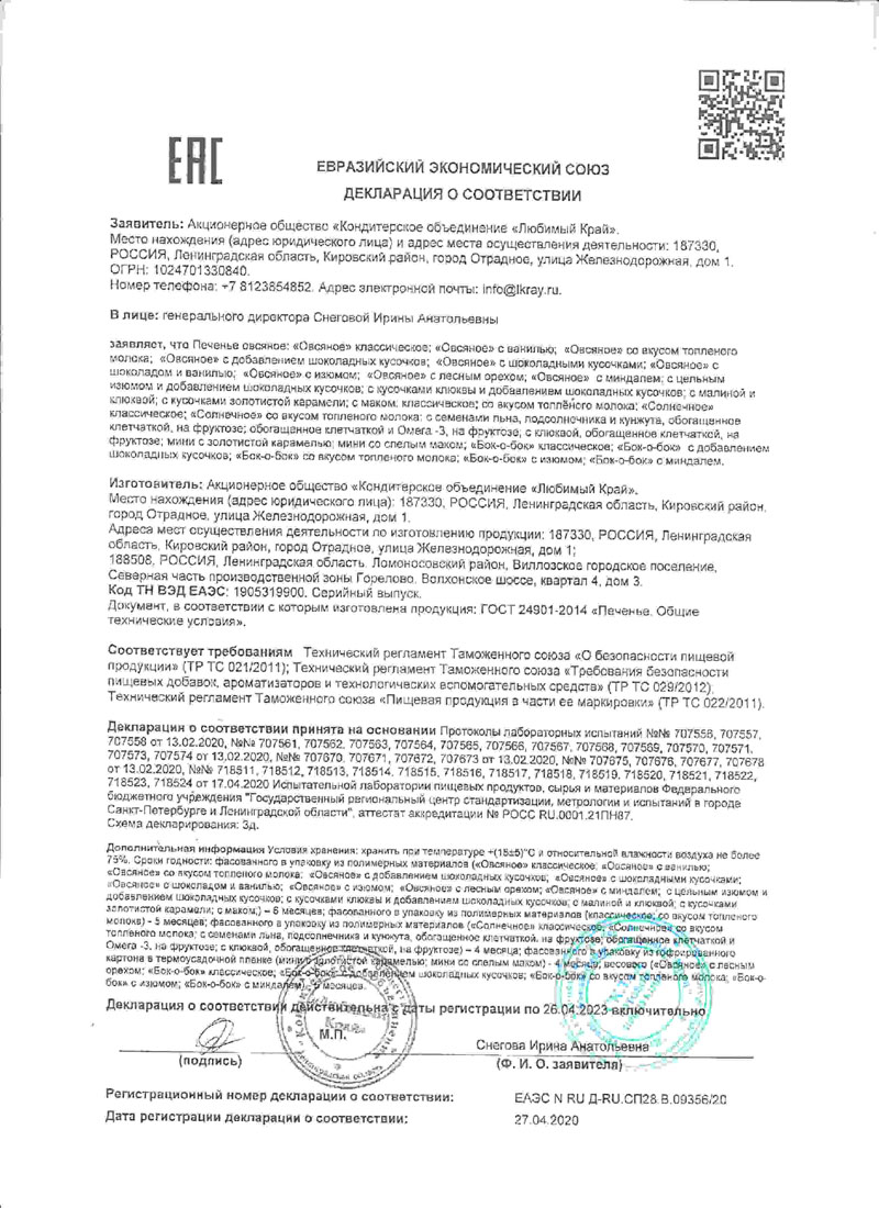Печенье "Посиделкино" сдобное творожное с апельсиновыми цукатами. Вес 250 г.Состав: мука пшеничная хлебопекарная высшего сорта, маргарин,сахар-песок, клейковина пшеничная, продукты переработки молока сухие(молочная сыворотка, творог); патока, цукаты апельсиновые( апельсиноваяцедра, инвертный сироп, красители: тартразин, красный очаровательный АС,бриллиантовый голубой); яичный меланж, влагоудерживающий агент:глицерин; разрыхлители: соли углеаммонийные, пирофосфат натрия, натрийдвууглекислый; соль поваренная, эмульгатор: лецитин соевый; регуляторкислотности: лимонная кислота; ароматизатор натуральный.Продукт может содержать следы фундука, миндаля, кунжута.Противопоказано при индивидуальной непереносимости к белку молока и/илияичному белку.Пищевая ценность в 100 г продукта: белки 13,8 г, жиры 20,7 г, углеводы 59,7 г.Энергетическая ценность: 476 ккал.Хранить: при T 18 +/-5 градусов и относительной влажности не более 75%.Срок годности: 4 месяца.ТУ 9131-004-50893606.