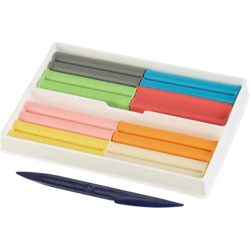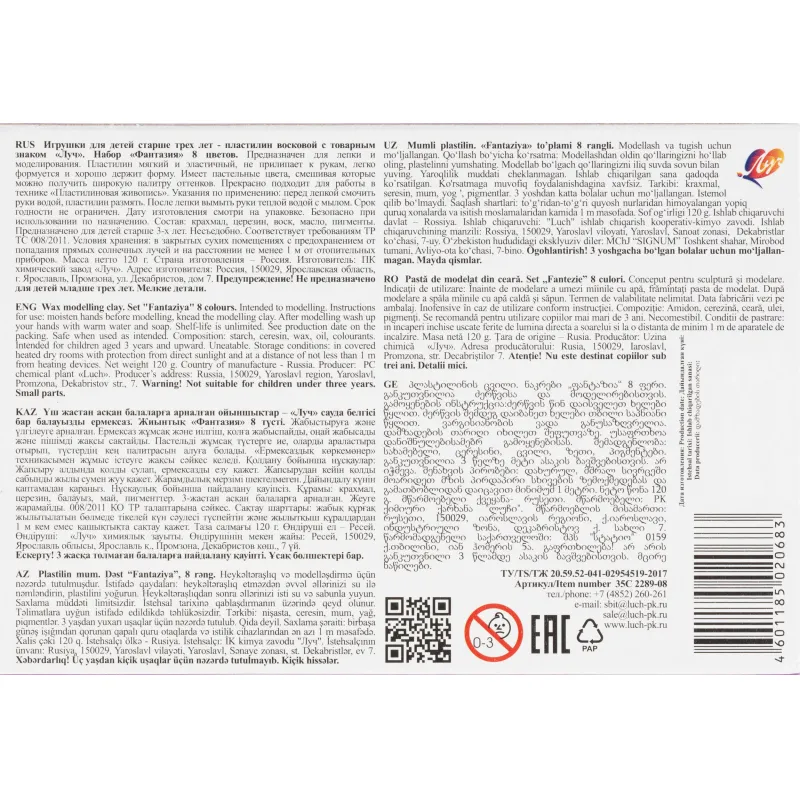 Пластилин обладает пластичностью и не прилипает к рукам. В комплект входит пластиковая стека для удобной работы с формами и деталями. Упакован в картонную коробку размером 166×114×18 мм. Общая масса набора составляет 120 г.