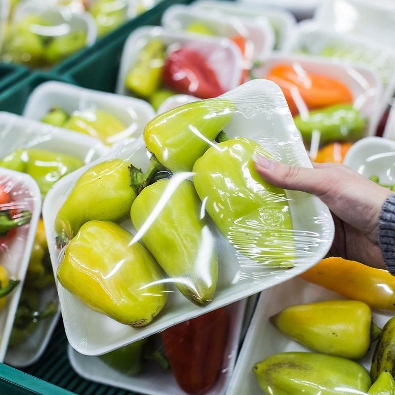 — обладает повышенной липкостью, при растяжении крепко фиксирует продукты на подложке, выгодно подчеркивая их форму и объем;