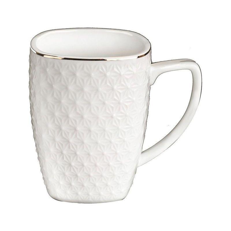 Роскошная кружка Снежная королева изготовлена из прочной керамики. Узор нанесен по квадратной форме и напоминает переплетение нитей. Обводка золотом подчеркивает элегантность изделия.