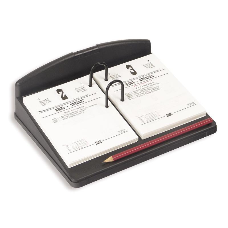 Подставка Uniplast для перекидных календарей изготовлена из пластика черного цвета, размер — 230?180?85 мм. Оснащена двойным дуговым фиксатором и желобком для ручки или карандаша. Расстояние между дужками 4,5 см. Перед использованием необходимо открепить дуги, прикрепленные к обратной стороне подставки клейкой лентой, и вставить их в соответствующие отверстия на лицевой поверхности.