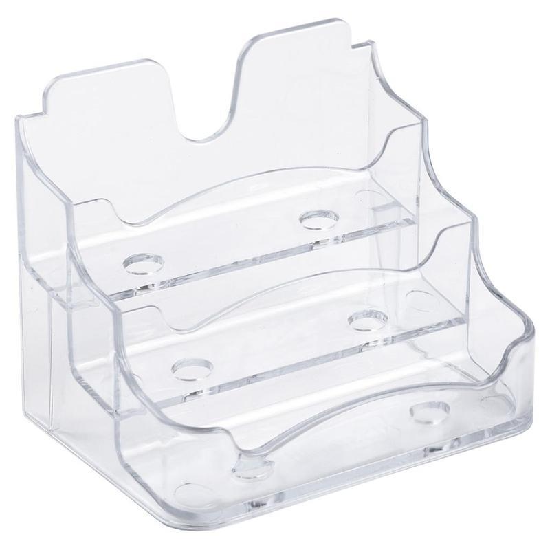 Подставка под визитки имеет 3 отделения, расположенных каскадом.%0AГабаритные размеры: 82x102x70 мм. Глубина отделений: 1x25 мм и 2x20 мм%0AЭргономичный дизайн, закругленные углы.%0AДля настольного размещения. Устойчивая, легкая, прочная.%0AИзготовлена из сертифицированного полистирола.