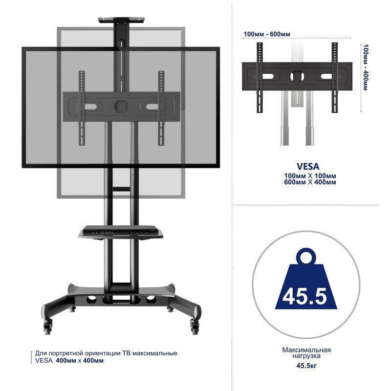 Стойка с кронштейном Onkron TS1551 предназначена для экранов с диагональю от 32 до 65 дюймов. Эта мобильная стойка для телевизоров выполнена в черном цвете. Два надёжных столба позволяют регулировать высоту в диапазоне 1200-1500 мм.